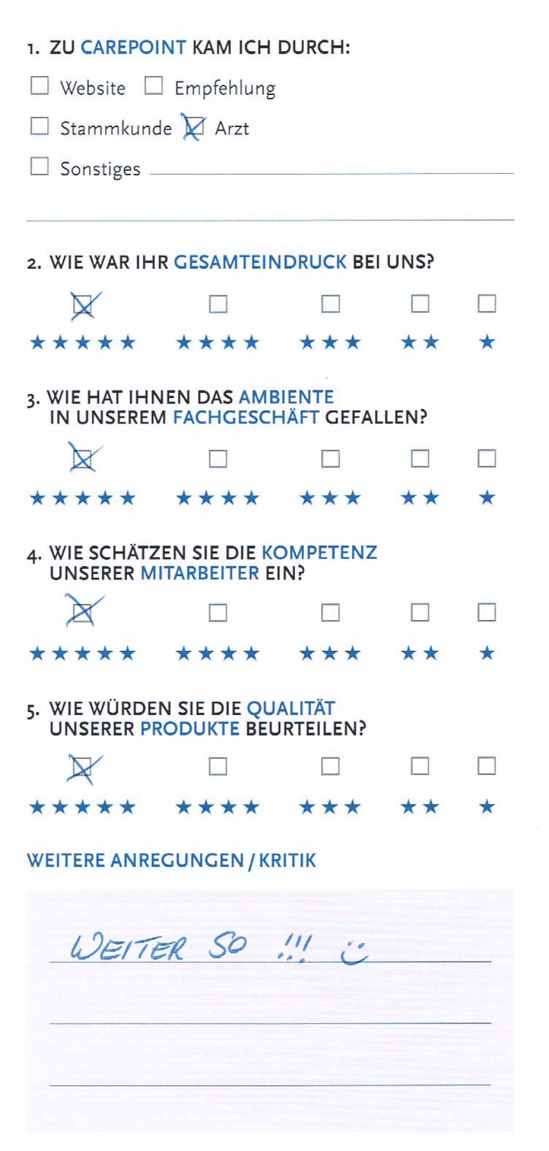 Im Gesamtergebnis wurden alle getesteten Sanitätshäuser als „Besonders kunden- und serviceorientiertes Sanitätshaus“ ausgezeichnet. Insbesondere in der Einlagenversorgung konnte das Verkaufsteam punkten. Mit dem Beratungs-Check-Siegel an der Eingangstür kann der Kunde sofort erkennen, dass das Sanitätshaus seiner Wahl in den wichtigsten Kriterien der Kundenzufriedenheit getestet wurde und seinen Kunden eine außergewöhnliche Qualität bietet.
